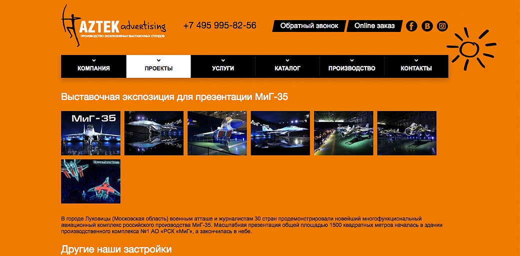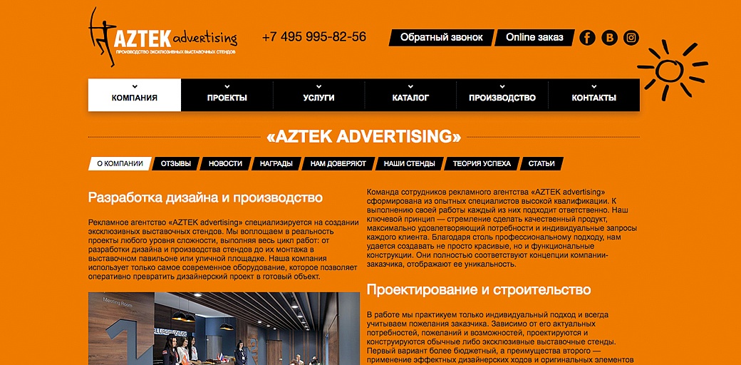 «AZTEK advertising» специализируется на создании эксклюзивных выставочных стендов. Реализовываются проекты любого уровня сложности, выполняется весь цикл работ: от разработки дизайна и производства стендов до их монтажа в выставочном павильоне или уличной площадке в любой стране мира. Компания использует только самое современное оборудование, которое позволяет оперативно превратить дизайнерский проект в готовый объект.